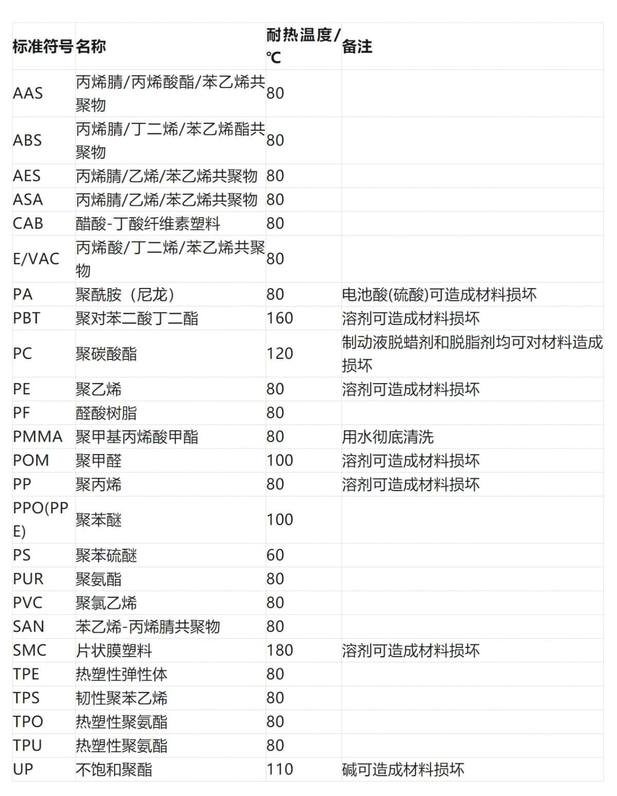 一般的塑料件都会在其背面标有其组成成分,用于让人们辨别其特性,这有利于提高它的循环使用率,并且可以根据它的特性确定其修理的方法。