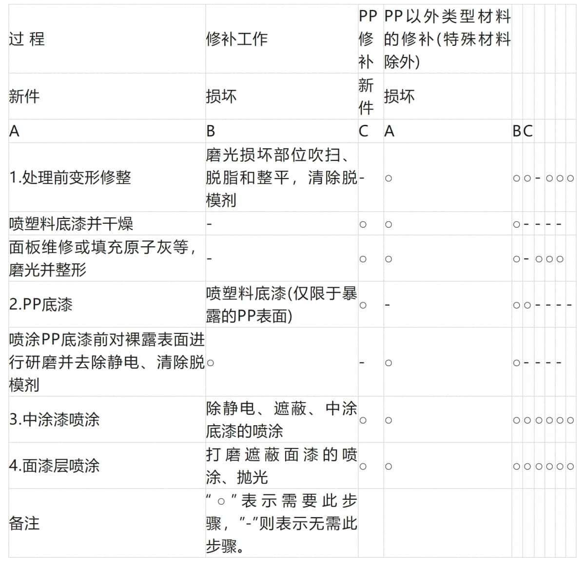 b.PP底漆。PP底漆是在塑料和中涂底漆之间的涂层,用于提高中涂漆的附着力,同时对原材料表面具有良好的附着力。只在塑料件裸露的表面上施涂。热固性塑料(PUR)件上则无需施涂。注意:不要施涂过厚的PP底漆涂层,否则将导致涂料脱落或是羽状边收缩。